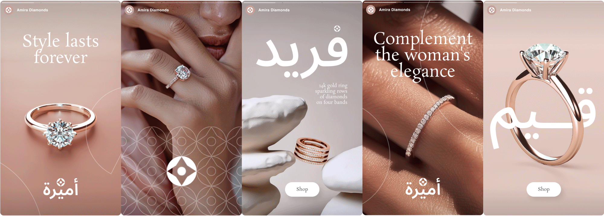 For Amira Diamonds, I crafted a narrative capturing the essence of our luxury diamonds and curated a cohesive social media presence. Through styled photography, graphics, and AI-generated images, I highlighted our jewelry’s bespoke nature, forging a deep connection with our elite female audience.