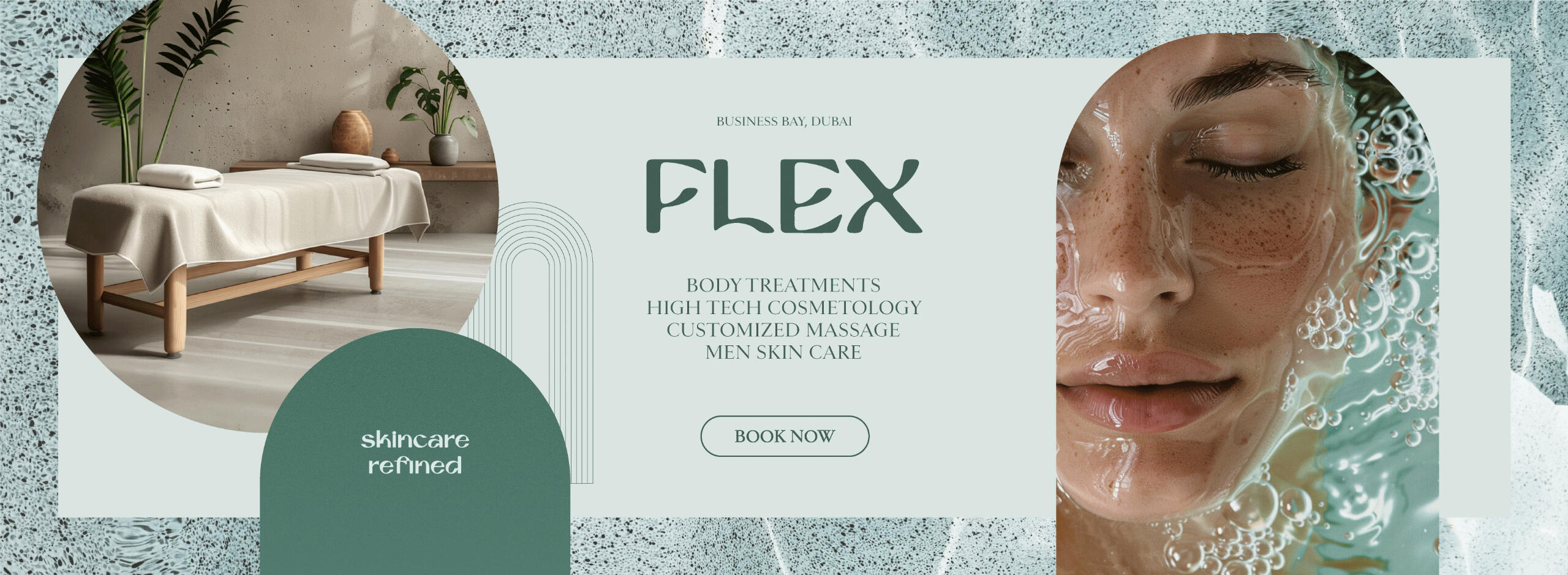 I designed the identity for Flex, a spa studio in Dubai. Specializing in skin treatment, cosmetology, and massages, the brand features a natural, minimalistic aesthetic with sophisticated patterns, fresh, calm colors, and soft round shapes in the logo and layouts.