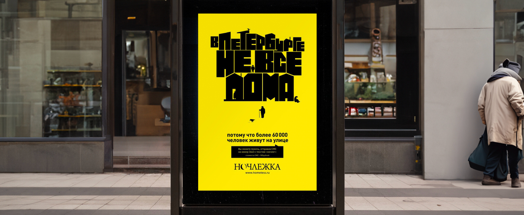 I developed a campaign for Nochlezhka, the oldest charity for the homeless, leveraging St. Petersburg's cultural identity to raise awareness. The slogan, "Not everyone is at home in St. Petersburg with 60,000 on the streets," is paired with a font styled after the city's historic buildings