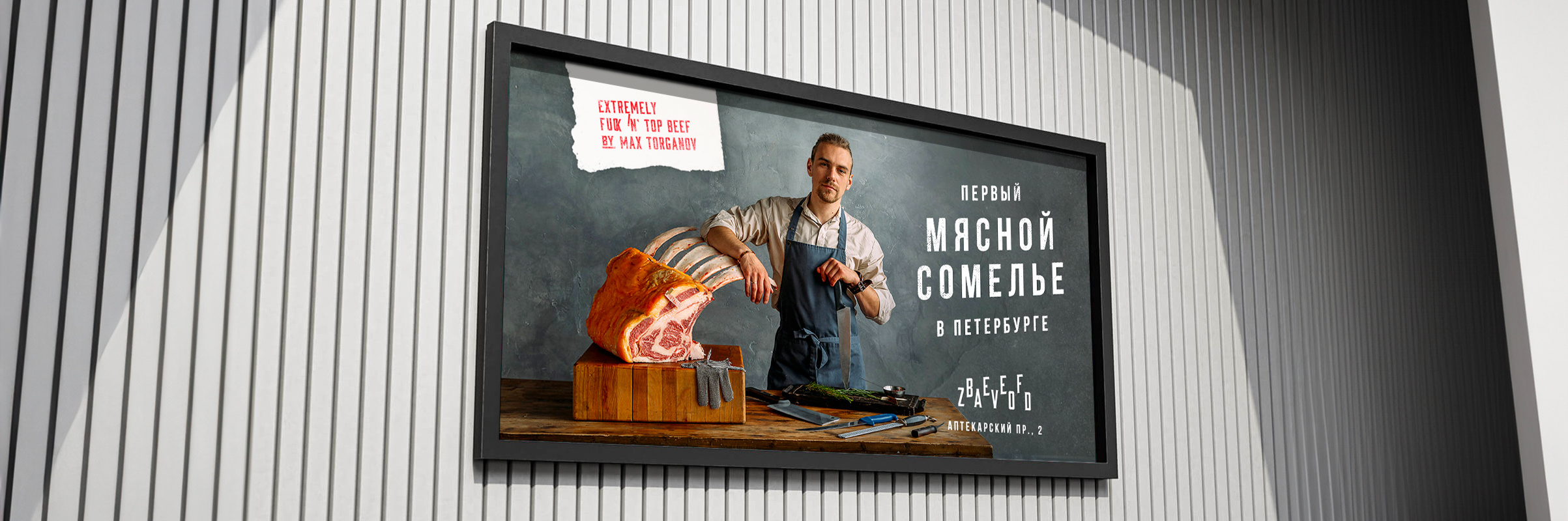 To launch St. Petersburg’s first exclusive meat restaurant, I created an ad campaign featuring the city’s first meat sommelier. I highlighted meat director Maxim Torganov’s unique skills and directed a photoshoot of him. The restaurant specializes in dry-aged meat, offering rich flavors and distinctive cuts.
