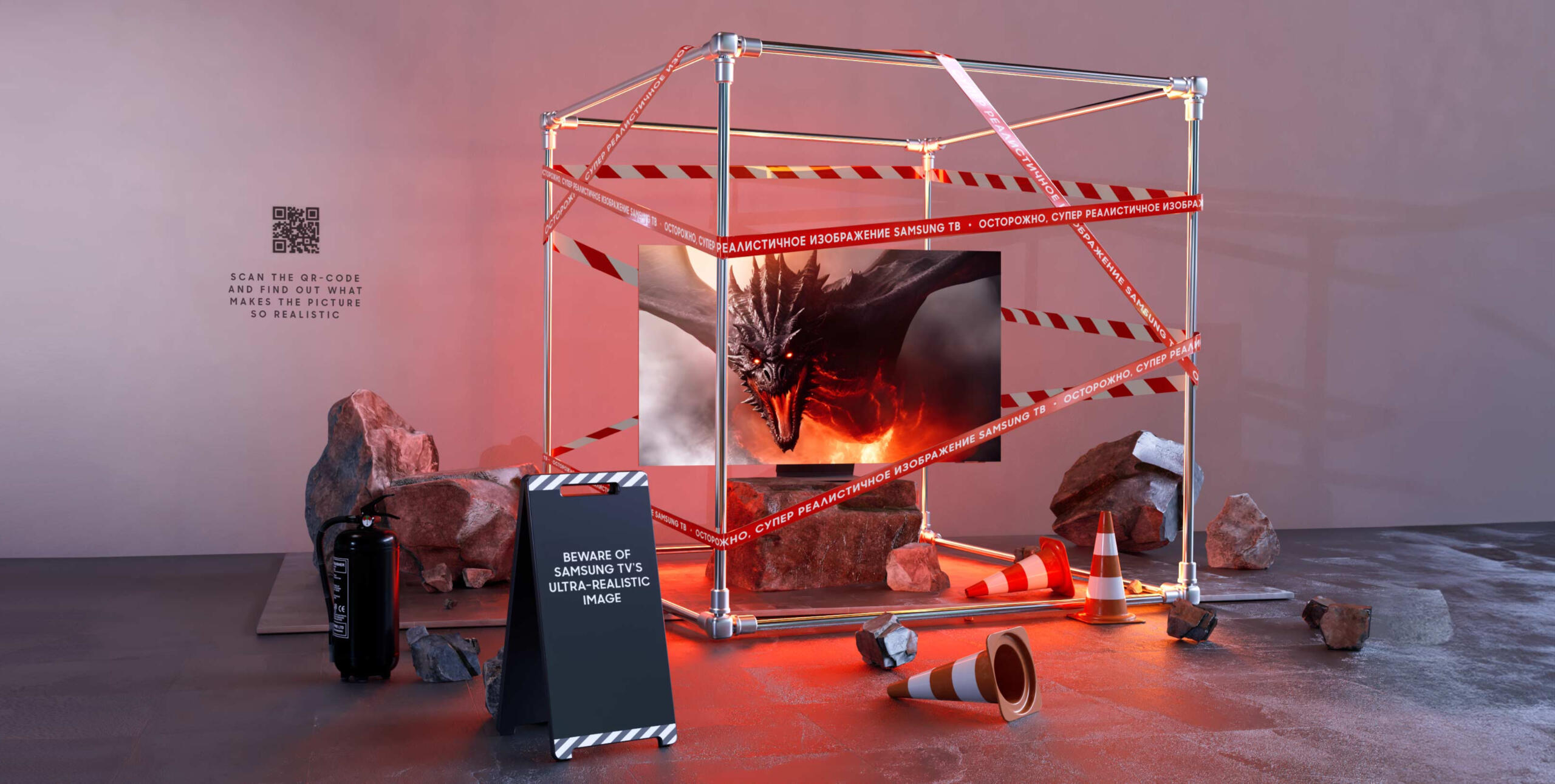 In retail, the norm is ‘Come closer.’ We say: ‘Stay away.’My art direction features a Neo QLED 8K with a lifelike dragon, roaring and reacting. Warned with "Beware of super-realistic image." A QR code leads to the product page, revealing the magic behind the scene.